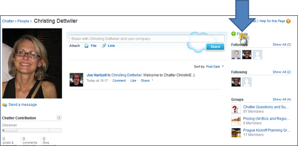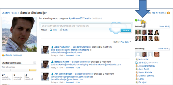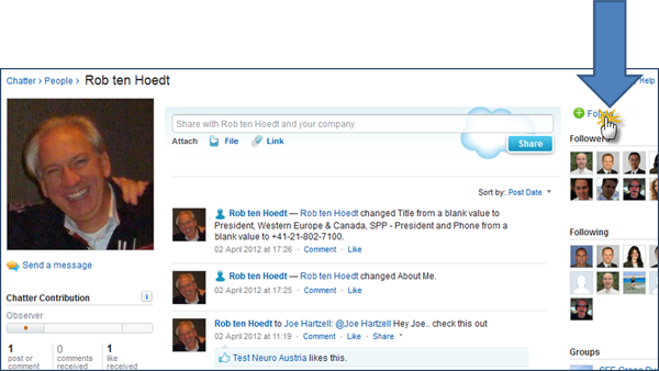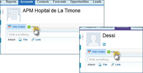 Eg. You are a sales rep. You need to be kept up-to-date with changes of your accounts / contacts. In this case, you would then need to follow your accounts / contacts. Simply click on the "Follow" button to get up-to-date information pushed to your Chatter feed.