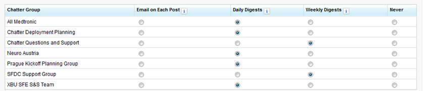 - Below this you will see a table of all the groups that you have joined. You can set the Chatter email frequency of each group individually here.