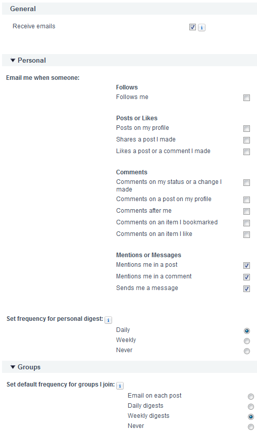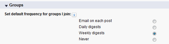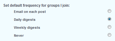 - "Set default frequency for groups I join": here you can set a default frequency of emails to be sent to you when you join a group.