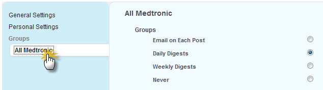 - On the left-hand column there will be a list of groups that you have joined. (There is only 1 group in the screenshot below.) Click on the group and select email notification settings for each group.