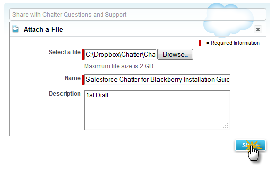 - A file upload dialog box will appear. Click "Browse" to locate your file in your computer, fill in the rest of the form, and click "Share".